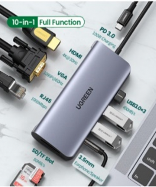 - Bộ chuyển đổi USB Type C to HDMI + VGA + LAN 1Gbps + Hub USB3.0 + SD/TF + Audio Ugreen 80133 cao cấp. là thiết bị chuyển đổi đa năng cao cấp chuyên dùng cho các thiết bị hỗ trợ cổng USB Type C đời mới như Macbook, Lenovo, HP... với các tính năng chính bao gồm: